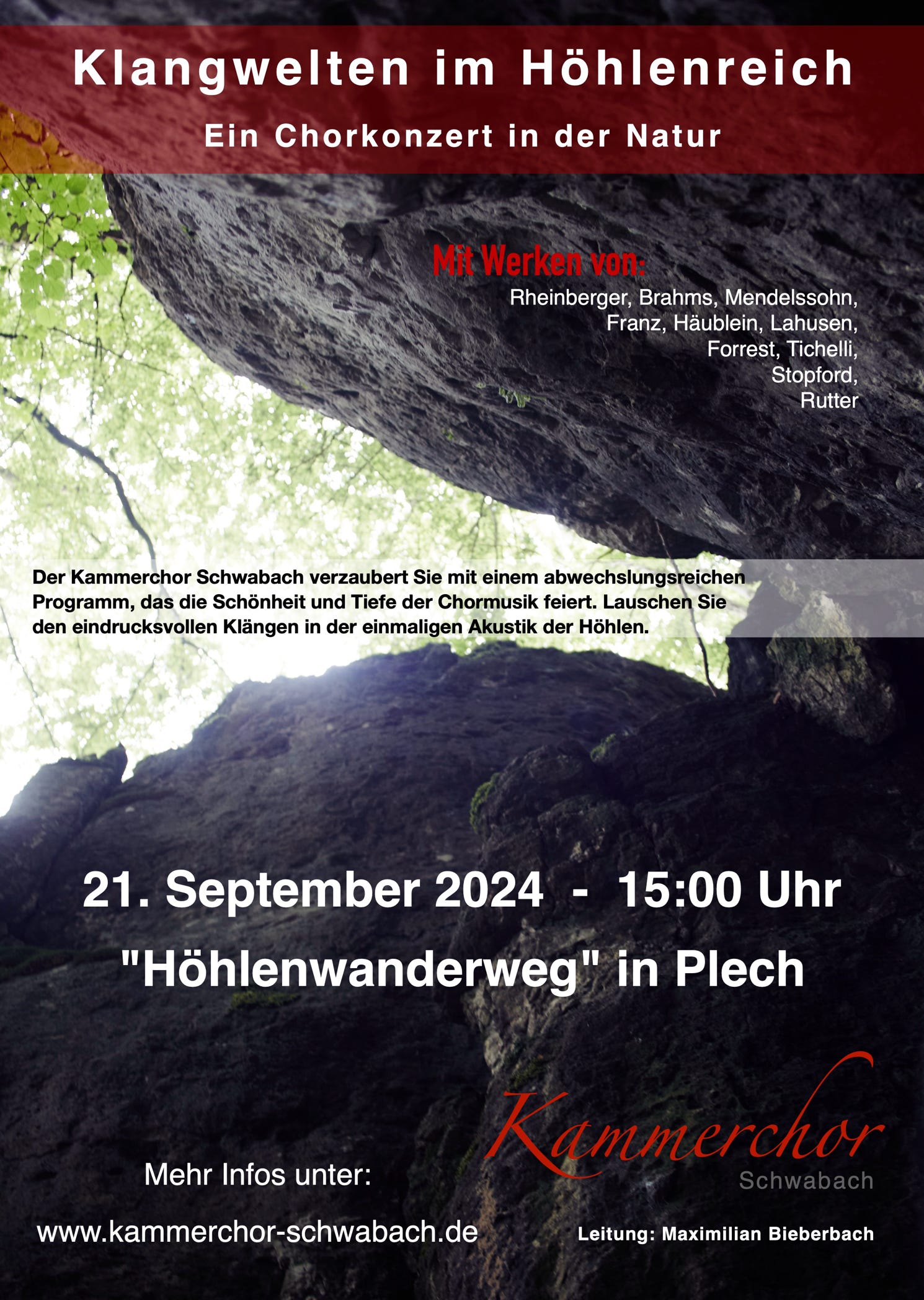 Erleben Sie einen außergewöhnlichen Chorkonzertabend mitten in der Natur! Der Kammerchor Schwabach unter der Leitung von Maximilian Bieberbach lädt Sie herzlich zu einem stimmungsvollen Konzert vor den Höhlen des "Höhlenwanderwegs" in Plech ein.